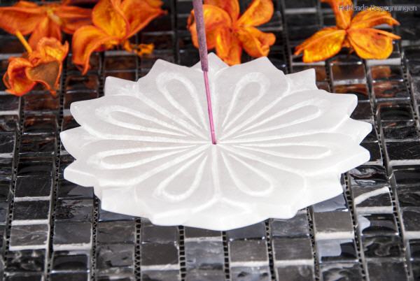 White Lotus Alabasterhalter Ein außergewöhnlich schöner Halter! Anmutig und formschön veredelt er unsere Räucherung mit Stäbchen. Alabaster steht für geistige Stabilität, der Lotus für die Transformation hin zur Vollkommenheit. Handgeschnitzt. Alabaster; ø 10 cm